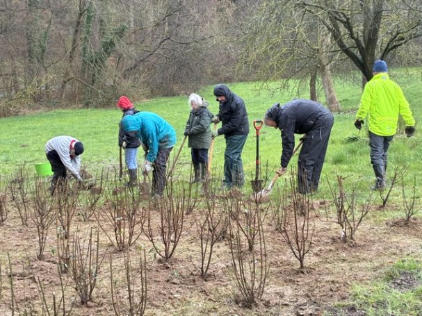 Nachdem Ende Februar die Kopfweiden geschnitten wurden, stand am Samstag, dem 28.03.2026, eine andere Aktion an. Ein Saum aus heimischen Wildsträuchern wurde gepflanzt. Er bildet die Verbindung zum Steinwall, der demnächst auf der Wiese aufgeschichtet werden soll, und bietet Schutz, Nahrung und Nistmöglichkeiten. Gegen 10.00 Uhr trafen sich die Mitglieder der Arbeitsgruppe „Streuobstwiese“ und weitere Helfer aus der AG Natur an der Wiese.