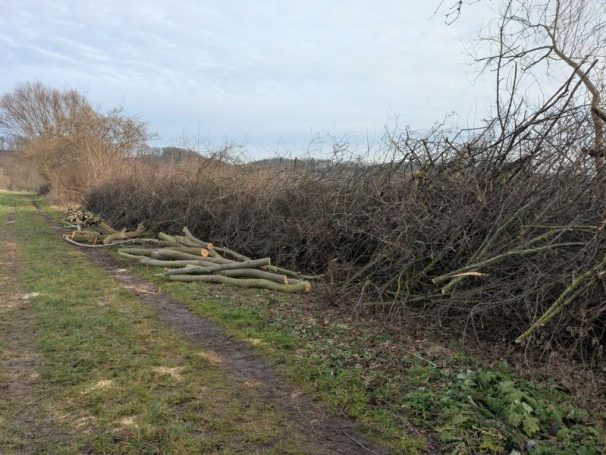 Am Samstag, den 17.01.2026, stand wieder der Heckenschnitt der über 30 Jahre alten Benjeshecke am Gut Deesberg an. Zusammen mit Wolfgang Heeper, der die Aktion leitete, trafen sich sechs weitere Mitglieder der AG-Natur ausgerüstet mit Astscheren und Motorsägen. Während sich die Landschaft eine Woche vorher noch schneebedeckt präsentierte, konnten die Ehrenamtlichen an diesem Wochenende bei Sonnenschein und moderaten Temperaturen arbeiten.