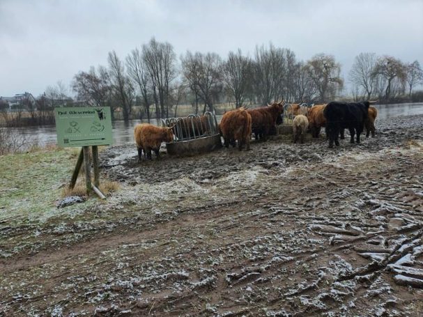 Auch zu Lande und in der Luft konnten Graugänse, Kormorane, Silberreiher, Graureiher, Turmfalken, Lachmöwen, Ringeltauben, Buntspecht, Eichelhäher, Rabenkrähe, Blau- und Kohlmeisen, Stare, Amsel, Wacholderdrosseln, Buch- und Grünfinken, Steppen- und Silbermöwen beobachtet werden. Höhepunkt war der prächtig gefärbte Eisvogel, der sich im Gebüsch in Ufernähe aufhielt. Am Schluss erfreute ein Trupp Schwanzmeisen, der munter in den Zweigen turnte, die Teilnehmer. Auch einige Vierbeiner zogen die Gruppe in ihren Bann: Die Wiesen am großen Weserbogen werden mit Schottischen Hochlandrindern beweidet.