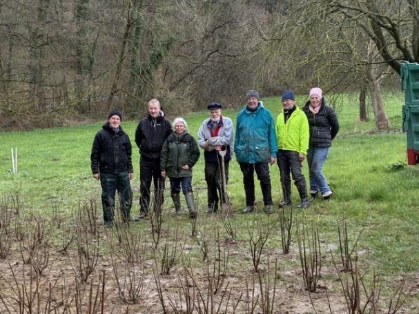 Nachdem Ende Februar die Kopfweiden geschnitten wurden, stand am Samstag, dem 28.03.2026, eine andere Aktion an. Ein Saum aus heimischen Wildsträuchern wurde gepflanzt. Er bildet die Verbindung zum Steinwall, der demnächst auf der Wiese aufgeschichtet werden soll, und bietet Schutz, Nahrung und Nistmöglichkeiten. Gegen 10.00 Uhr trafen sich die Mitglieder der Arbeitsgruppe „Streuobstwiese“ und weitere Helfer aus der AG Natur an der Wiese.