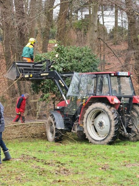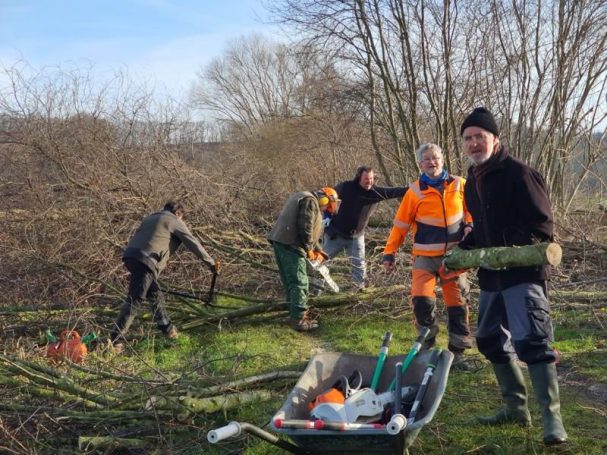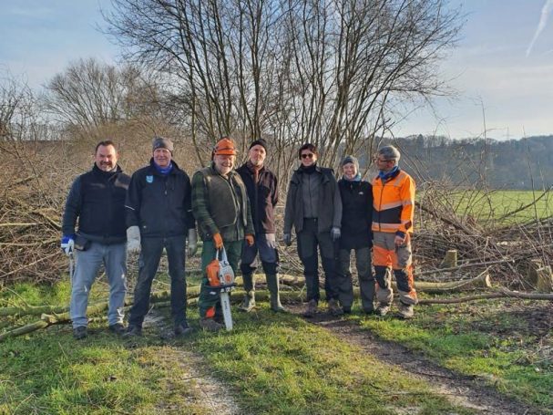 Am Samstag, den 17.01.2026, stand wieder der Heckenschnitt der über 30 Jahre alten Benjeshecke am Gut Deesberg an. Zusammen mit Wolfgang Heeper, der die Aktion leitete, trafen sich sechs weitere Mitglieder der AG-Natur ausgerüstet mit Astscheren und Motorsägen. Während sich die Landschaft eine Woche vorher noch schneebedeckt präsentierte, konnten die Ehrenamtlichen an diesem Wochenende bei Sonnenschein und moderaten Temperaturen arbeiten.